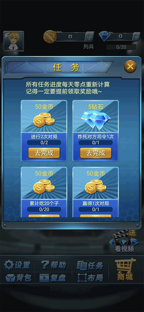 在多人模式中,玩家则可以在翻翻棋和暗棋的新手场、中级场和高级场中遇到不同实力的对手,尤其在多人模式中,玩家还可以通过做任务的形式获取多人模式中非常有用的钻石道具。喜欢下军棋,希望在游戏中找到旗鼓相当的棋友的玩家,就快来下载这款单人、多人通吃的游戏吧。