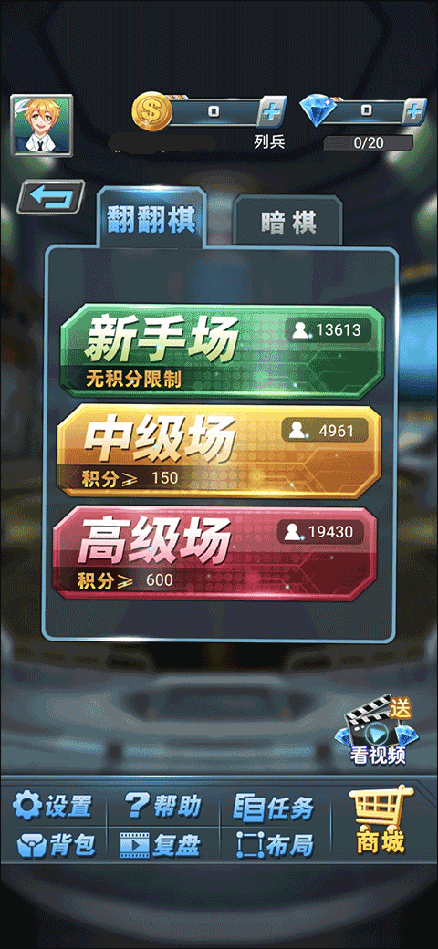 2、在模式选择界面可以选择翻翻棋或者暗棋,不同于单机版的是,多人模式下,玩家是有积分系统的,不同的积分将让玩家遇到不同段位的对手;