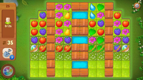 前期我们要做的就是要尽量组合炸弹,把锁链和草坪炸开。努力组合相近的炸弹,这样子可以引发连爆,然后就可以一次性炸开多处草坪,运气好还可以再额外组合多个道具。