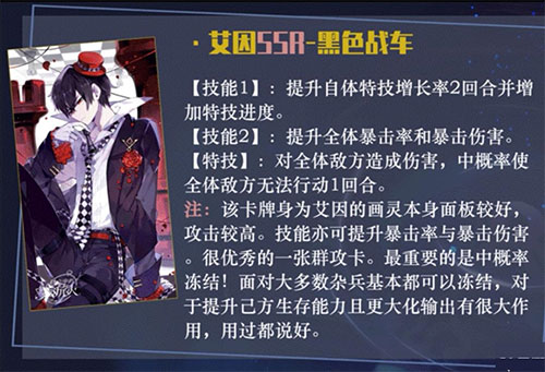 技能不仅可以增加暴击和暴伤,还能增加自身的特技速度和增长率,在辅助里攻击力还是很强的,本身不脆的面板再加上强大的群体输出增益,顺便还附带本身拉条和高概率的群体硬控,这张卡牌超出同等级卡牌。