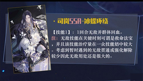 全体无敌的技能可谓是救命法宝,在现阶段人物少有无视无敌功效的情况下,属于开荒必备卡之一。不仅拥有群体回血技能,还能降低敌方特技增长率和物理攻击,相当于是变相增加我方全体的生存能力,所以这是一张在技能组里非常出色的卡。不过在遇到敌方输出和我方输出均衡的情况下,会容易出现回血不足的情况。