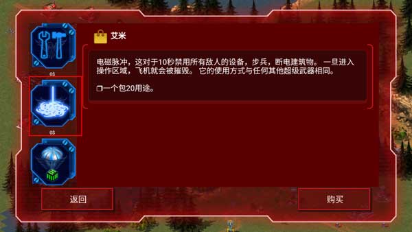 电磁脉冲,这对于10秒禁用所有敌人的设备,步兵,断电建筑物。一旦进入操作区域,飞机就会被摧毁。它的使用方式与任何其他超级武器相同。