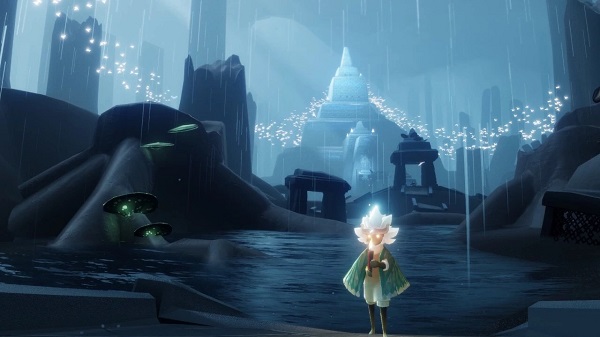 穿越过【云野】最高处的宫殿后,天色变灰,云层变厚,风势猛烈,并伴随着点点小雨。穿越雨云,我们将来到天空王国的第三个场景——雨林。