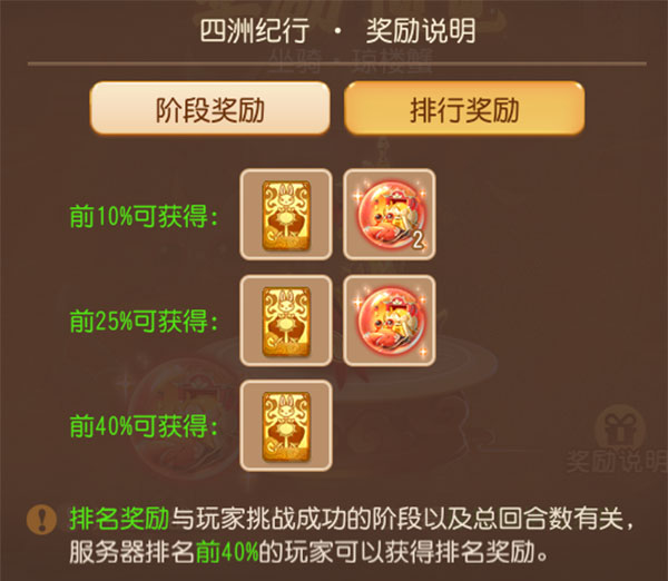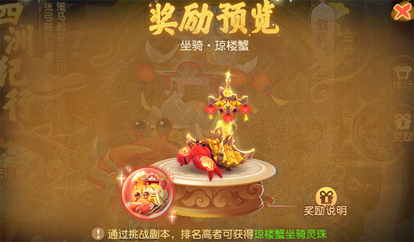 四、全新坐骑等你来战除了阶段性奖励之外,四洲纪行副本还会根据服务器排行给予排名奖励。