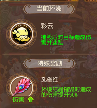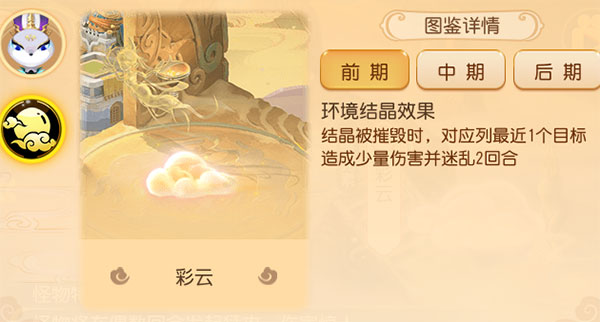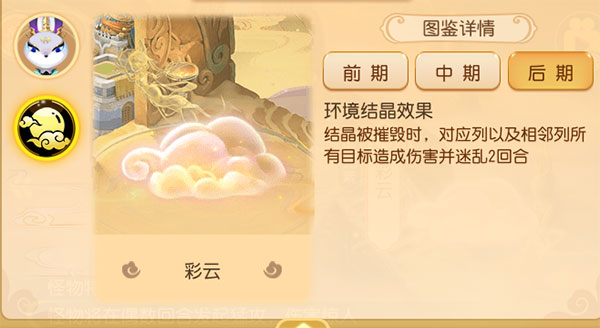 每过一回合,环境结晶都会逐渐演变,通过击碎不同时期的环境结晶,可以收到不同的增益效果。比如,彩云结晶初期仅会将对应列最近的1个目标造成少量伤害并迷乱2回合。