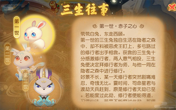 1、形态轮转,三世浮沉就像三生兔的名字一般,历经三世的三生兔一共有三种形态。分别是——“第一世·赤子之心”,“第二世·叛离之殇”以及“第三世·成神之怒”。
