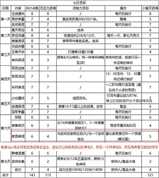 从图表中可以看到,如果我们正常每天玩游戏,把能打的都打完,可以获得113点目标点,但是需要的目标点是120点,也就是说我们需要额外付出获得这7点。所有过程中,注意一下就可以获得的内容我也写在表上了,请各位小将军注意。