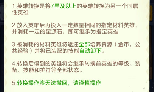 重生与转换是在一个界面中的,如果玩家找不到转换界面,可以在重生的旁边找到。转换可以将七星及以上的英雄转换成同属性英雄,然后还需要指定材料英雄,以及星源石,才能继承为指定英雄。而转换是无法撤回的,玩家在转换前一定要想好再转换。