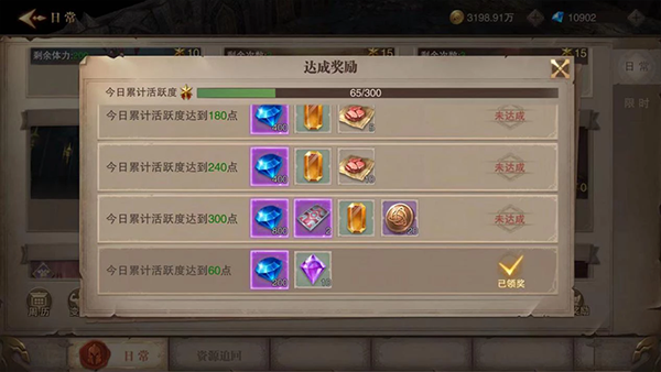 当前人物可以通过完成日常活动获取活动达成奖励。当活跃度达到300点时,可以获得活动奖励,奖励中包括荣耀通宝道具。