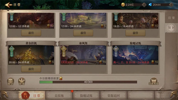 进入日常活动中可以看到除魔试炼活动,活动在每周的一,三,五的20:00-24:00点开启。从除魔试炼的第一层开始挑战,每一层挑战成功可以获取到1个除魔徽章。