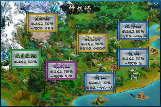 其他六座名山在没有帮派占据时为固定的修炼空间30个,用户进入挂机修炼为名山默认的加成速度,其中峨眉和昆仑山的基本速度提升20%,其他4座基本速度提升10%