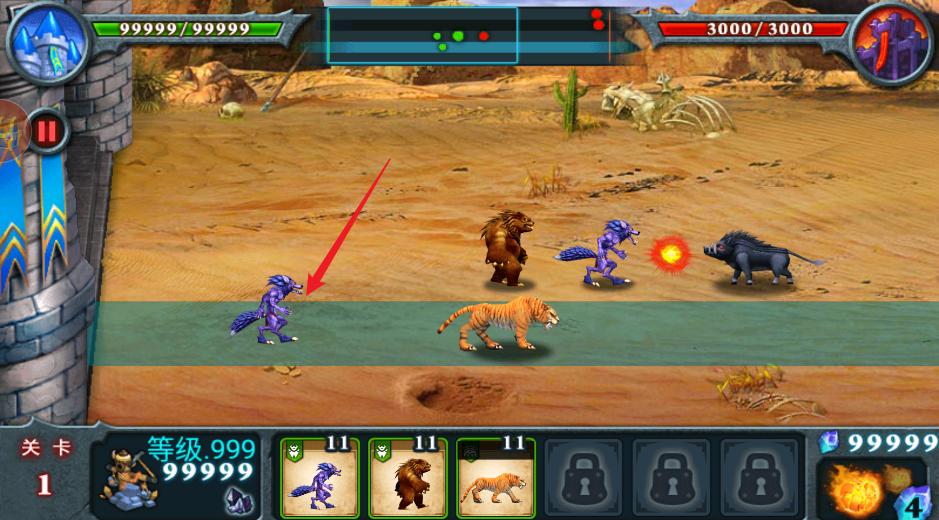 6、消耗资源后,将猛兽卡牌拖入战场,即可自动对敌发起攻击;