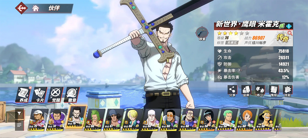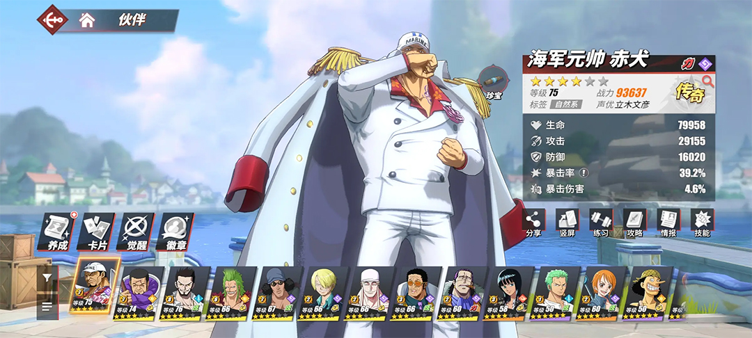 3、如果各位打算零氪或者微氪的话,在开局伙伴的培养上,就可以主要培养路飞、索隆、奈美作为自己的主力伙伴。就算是零氪也可以在一个月左右的时间将A卡路飞提升至六星全金,而六星的A卡在实用性上是高于五星的SS卡。当然,各位也可以选择自己喜欢的伙伴来进行培养。