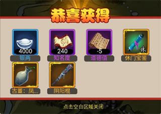 26、一代枭雄:选帮助育空大师,加10道德。打掉喽啰不杀加5道德。第二波喽啰打完选择搜身寻物,可以得一个紫手套。最后打完奖励如下。