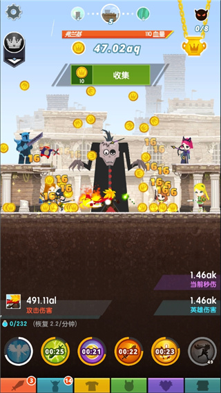 1、点击可以执行攻击、杀戮、收集金币和雇用英雄操作;