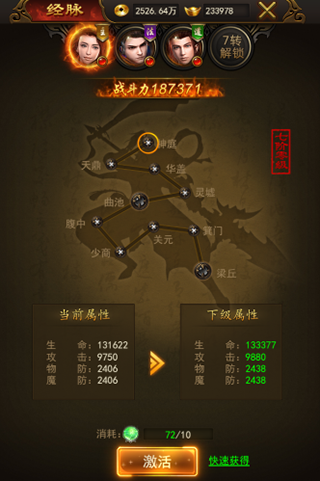 经脉系统可以增加玩家的生命、攻击、物防及魔防属性。游戏中玩家消耗真气丹可以激活经脉,并升级经脉的等阶与等级。