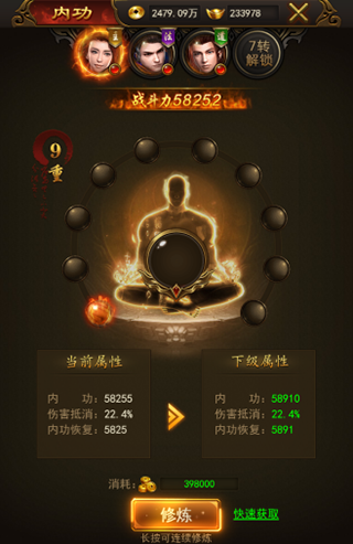 内功系统可以增加玩家的战力与属性,包括内功、伤害抵消与内功恢复属性。内功系统修炼分为多个重数,每一重有相应的需要修炼的格子数量,玩家消耗金币可以快速修炼,修炼满格子可以突破提升一重。