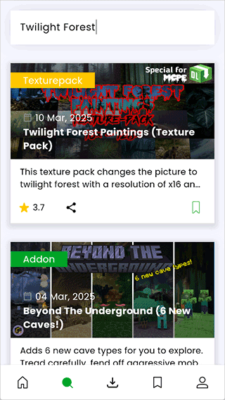 1、玩家可以直接通过MCPEDL软件提供的搜索功能,直接输入模组名称来搜索,例如暮色森林模组的英文名称:Twilight Forest来进行搜索