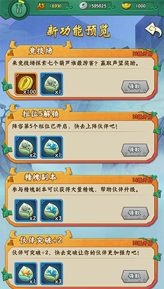 葫芦娃动画在过去可谓是无人不知、无人不晓,有很多人的童年都是陪伴着它走来的,至今依旧有一代又一代的人留念,随着现代的迅速发展,互联网飞速的成长,由这款动画改编的手游葫芦兄弟七子降妖也随之推出,游戏完美的将我们的熟悉的人物角色还原到其中,爷爷、穿山甲、大娃、蛇精、蝎子精、蜈蚣精、蛤蟆精等诸多人物,都将在这里悉数登场,且复刻了动画的经典剧情故事,并在其基础上,添入大量全新的剧情故事,让你回味儿时美好回忆的同时,又能拥有全新的剧情体验,收获更多的游戏乐趣。与此同时,游戏主打的是休闲的放置塔防玩法,拥有极为简单的操作手法设计,丰富的挑战玩法,以及自动挂机对战系统,玩法十分轻松,操作特别的简单,轻松解放你的双手,得到大量任务奖励,收获满满的喜悦感。