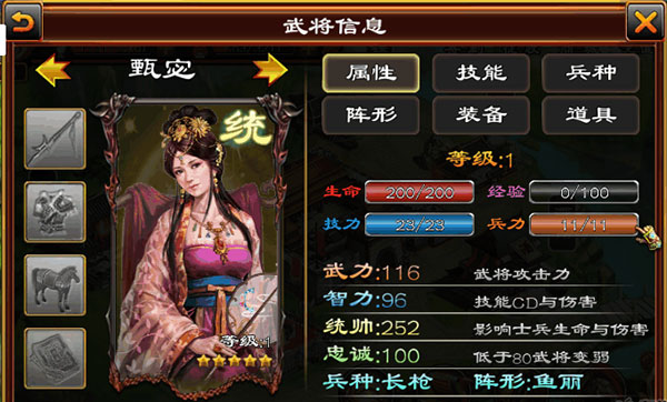 最后我们来看一看甄宓!三国里的妹子不多,统将更是少之又少。甄宓的属性还是很不错的,圣光和振奋都是统帅神技!而且甄宓刷副本也很好用,推图很快。虽然没有刘备黄忠好用,但是如果没有好的选择,用甄宓也不错,而且妹子很养眼呀!就跟小乔一样~