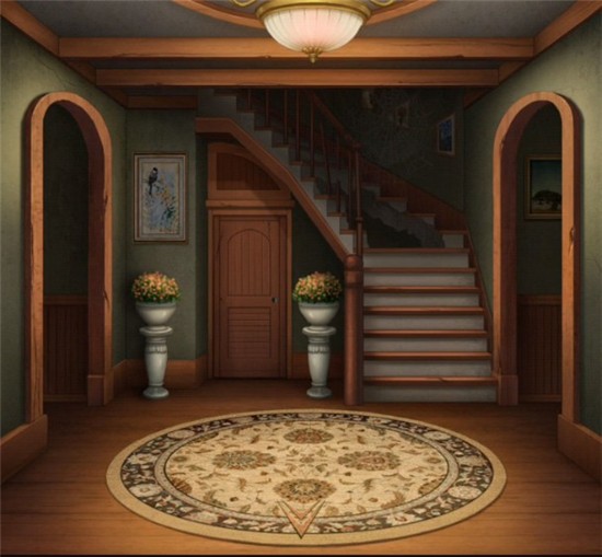 进入大厅,发现楼上去不了(暂时去不了,只能曲线绕上去),地下室的门也是锁着的,所以只能先走左右了(记得墙上的鸟图,四副画鸟的面对方向最后要用到)。