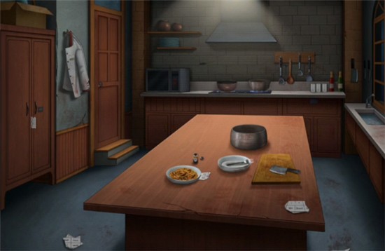 进入厨房,先收集碎纸片5/6,然后收集桌上的毒药线索,墙上挂着的衣服名牌和兜中的烟盒拿到,拿墙上挂着的用具,对着锅中用一下(做好准备)。