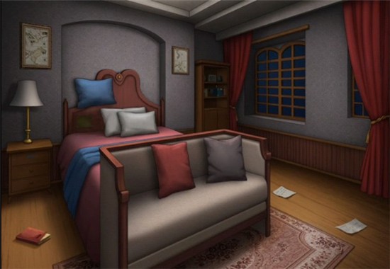 进入卧室后,简单探索一番吧,首先在窗帘后面,可以得到经常一个小红球,两个算是配套了,调查后方放书的架子,整理一下以后可以看到两个圆孔,把两个红球放进去(上方的瓶子中有一个一字螺丝刀记得拿)。床尾的沙发抱枕拿起来后发现一节电池,另一节电池则在床头柜最下方的抽屉中。
