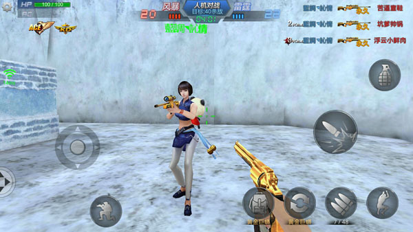 游戏画面左下角有一个圆圈状的虚拟按钮,右下角有个未显示的虚拟按钮,玩家通过滑动虚拟按钮控制人物的动作。其中左下角的虚拟按钮控制移动右下角的虚拟按 钮控制准星和射击。同时,在画面左上角设置按钮中有战绩查询、游戏设置、键位设置功能,左下角有蹲下按钮,画面右侧分布有跳跃、切换武器、换子弹、扔手雷 等按钮。