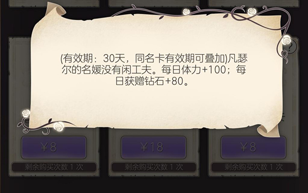 ②璀璨名媛卡,这个相当于月卡吧,有效期30天,每天可以获得80钻石和100体力,一个月只要18元。