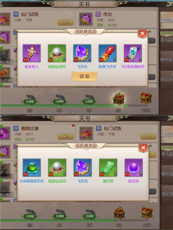 每日天书活跃度,可以得到2个精炼符和2个紫灵珠。