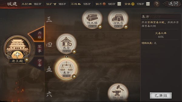 7、集市:可以在主接口政厅里的贸易功能里交换资源,等级越高,交易比率越高
