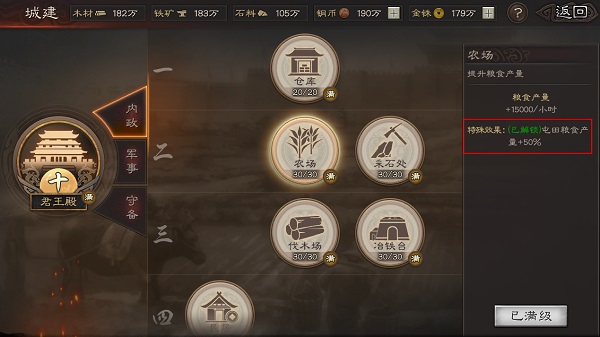 2、农场:提高粮食产量(与领地资源无关,自己城里产的),点到20级屯田获得量增加50%