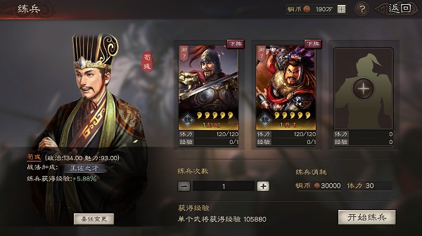 【最重要的友情提示】1个武将是独吃8.4W经验,练2-3个武将是平分8.4W经验,总量不变,所以单人练兵最合适