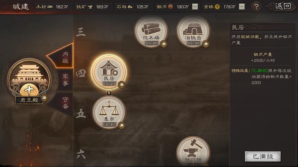 6、民居:提高铜币产量,点到20级每次收税多获得2000铜币