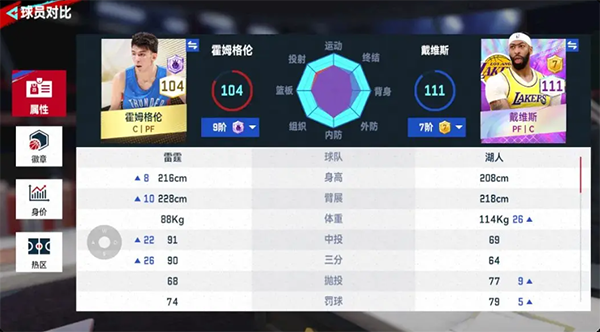 小编也在这里分析下为什么选这两个球员,首先如果一个球队里面小前锋和大前锋需要用金卡,那么说明队伍里有一个紫卡中锋和紫卡后卫,那其实锋线球员就需要更均衡的数值,而这两个球员也是在众多金卡锋线球员里数值较全面的。
