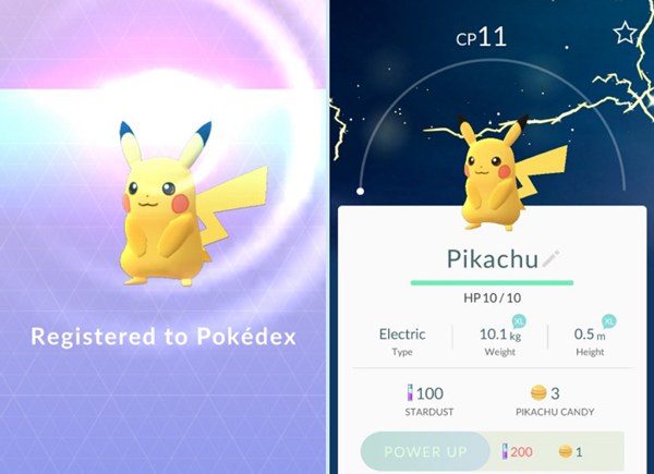 抓到的神奇宝贝可以在图鉴中检视,可以进行强化或是进化。强化宝可梦需要「星尘」与「糖果」,以提升战斗力与生命值。进化则需要耗费不少「糖果」,且要收服相同种类的宝可梦才行,进化后宝可梦的型态也会改变。如果抓到重复的宝可梦也可以点选「TRANSFER」将宝可梦换成「糖果」