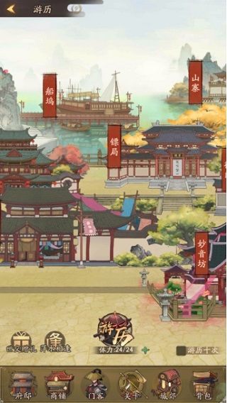 2、然后去的地方是去城郊游历,因为游历有概率可以指定传唤知己或者收双倍徒弟,且游历体力按时间恢复,下线之前也要先清空。当然还要记得收获一下世交的赠礼体力丹,每天也可以给世交一次赠予哦。
