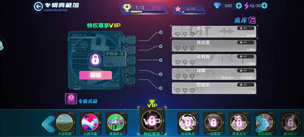 钻石最主要的花费来自典藏馆,典藏馆需要五个奖杯进行解锁,五个奖杯需要五首新歌才能获得,解锁典藏馆后,我们就可以看到很多不同的专辑,每一个专辑都由五首歌来组成,而专辑是需要解锁的,解锁完专辑后才可以继续解锁歌曲。
