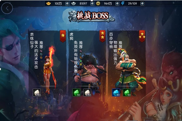 BOSS主要分为3种,分别是难度1星的赤练仙子,难度2星的虎痴,难度三星的百步穿杨。