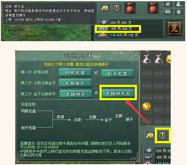 在元宝市场中需要使用银元宝购买物品,玩家可以使用银子兑换银元宝进行购买物品。