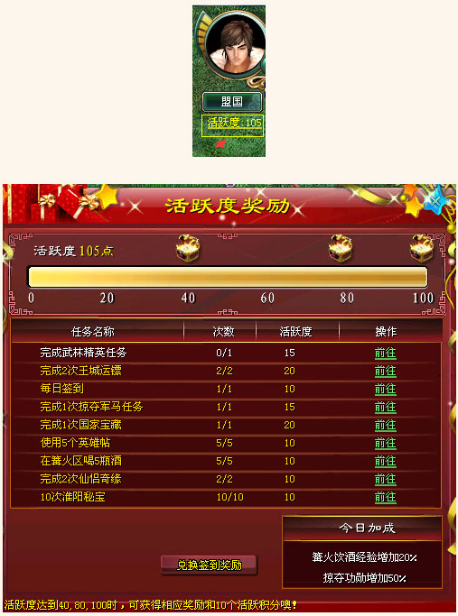 完成每日任务后系统会给予活力值,玩家可以在活跃度奖励界面领取礼包奖励,奖励礼包内含:真武石、精致升级宝石、签到积分。