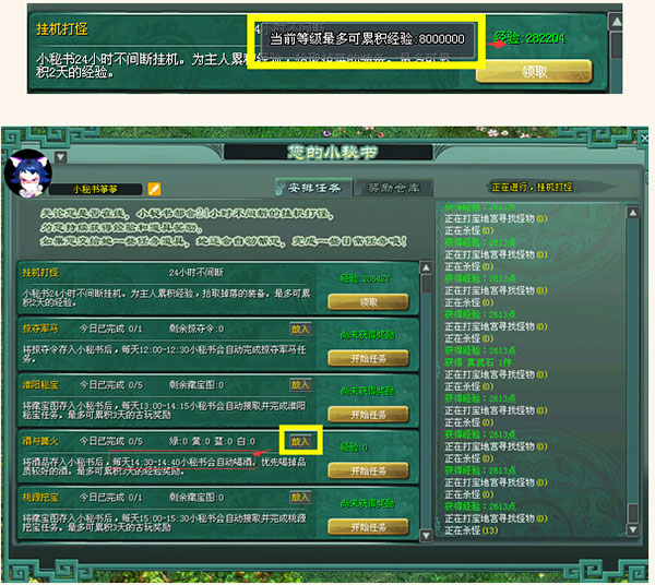 特别提醒:小秘书挂机打怪经验累积是有上限的哦!这个上限是按照你的当前等级逐步提升的,记得经验快慢之前提取以免浪费了!