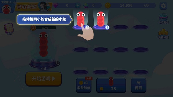 3、对局外的主界面中,游戏额外增加了一块3行4列的操作台,玩家花费金币即可购买新的小蛇,拖动相同类型的小蛇便可合成升级。