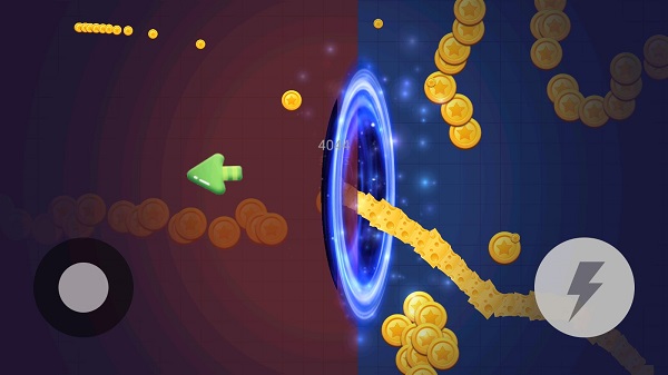 1、一方面,玩家可通过摇杆控制贪吃蛇走位,吃到的金币越多,体型越大、长度越长;另一方面,右侧加速键则可让贪吃蛇获得短暂的移动加速效果。