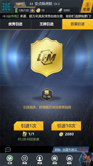 1、拥有一支超强球队,是所有荣耀冠军h5玩家的梦想。在游戏中,玩家们可以通过完成各类任务或消耗一定的游戏币来招募世界知名球星,邀请其加入自己的球队。根据球星的实力不同,分为了青铜、白银、黄金3个等级(64分以下为青铜,64分以上为白银,74分以上为黄金)。