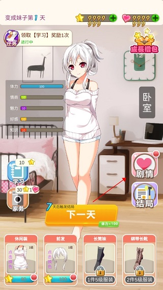 持续进入其他关卡,选择不同问题的答案,即可触发人物体力、情商、魅力、知识与好感度的提升,其他方面学习、佳丽可以获得星星数量,另外关于家装、换装等系统都是玩家可以体验的内容!