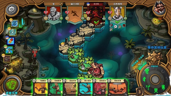 当然,在冒险公社游戏中除了冒险事件的丰富性,职业选择也是该作的一大特色,当前版本提供了佣兵、巫医、欺诈者、炼金术士等多种职业,每个职业都有自己的技能和进攻/防守防线,按照流派的区分,大致为偏向防守反击、卖血、回避争端、稳定发育等等,借由公共卡池和岛屿卡的搭配实现流派混搭,借此将有无限套路可供玩家自行组合。至于游戏规则,则与经典桌游《印加宝藏》比较相似,游戏正式开始前,玩家需进行牌组构建,选定职业后从公共岛屿中选出10张卡片,与从公共技能+职业技能中选出15张卡片共同构成在游戏中出现/使用的资源。