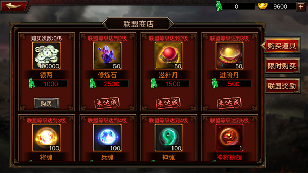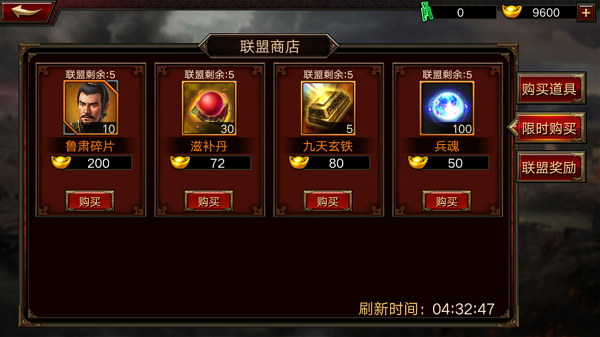 限时购买则是联盟共计少量购买次数,在刷新时间内每个道具每位联盟成员只可购买一次,限时购买出售的道具中还有几率刷新出武将哦,主公们先到先得;