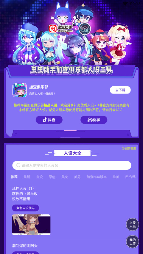 虫虫助手加查俱乐部人设工具是一款非常好用的游戏人设工具,里面有着海量加查俱乐部的人设,工具,游戏内容,每日还会推荐精品人设,玩家可以根据自己的喜好自由选择。同时软件体积小巧,界面干净简洁,使用操作起来也十分简单,支持一键点击复制人设代码,如果不会使用的话,还可以点击使用帮助查看教程,以此更好地进行使用。