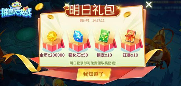 这个礼包是新手在渔场里升级到一定炮倍之后就会有的,没有任何门槛,只需第二天登录即可领取,奖励也是很丰厚的,有给金币、强化石和捕鱼道具,捕鱼萌新一定不要错过哦。